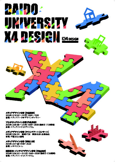 ALL お知らせ 先生の活躍 学生の活躍 イベント 地域連携 入試情報 2026.01.08 イベント/お知らせ/学生の活躍/建築専攻/インテリアデザイン専攻/情報学部 情報デザイン学科 本学学生の作品展示イベント「X4 DESIGN」を行います! 2026.01.08 入試情報 大同大学 2026年度入試「学力系一般選抜 前期(A方式・B方式)・共通テストプラス」出願スタート!