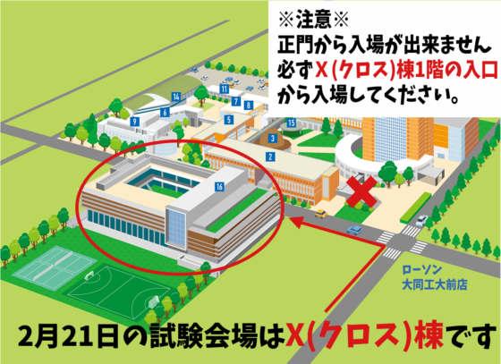 今回の試験会場はX棟となります。お間違えの無い様にご注意ください。大同大学キャンパスマップ