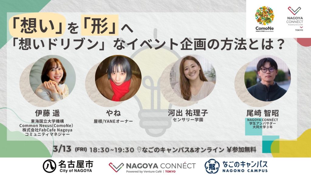 2026年3月13日(金)、名古屋のスタートアップ拠点「なごのキャンパス」にて、トークセッション「『想い』を『形』へ:『想いドリブン』なイベント企画の方法とは?」が開催されます。