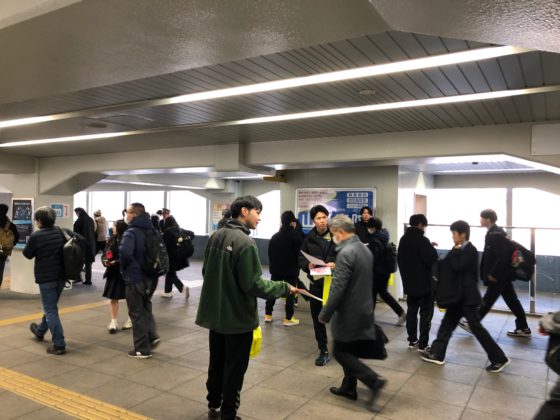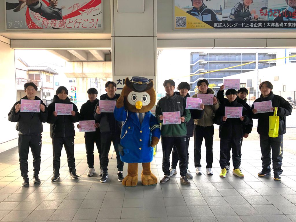 2026年2月17日(火)の朝、大同町駅改札前において、大学・高校・地域・南警察が連携した合同交通安全啓発キャンペーンを実施しました。