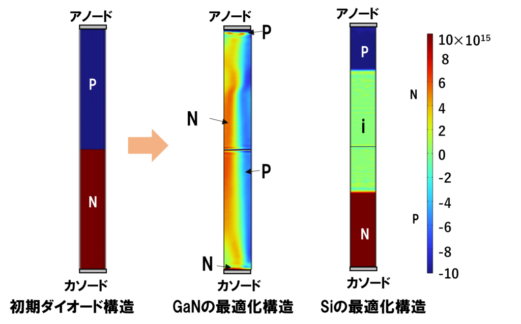 本論文では、PNダイオードを対象とし、オン抵抗は初期特性と同じで、耐圧特性を大幅に向上できる構造の導出を試みました。材料がGaNの場合は、ドリフト層がPNのコラムからなる構造が導出され、Siの場合は、ドリフト層がi層(真性半導体)になる構造が導出されました。この導出された構造は、理論的にも正しいことが証明されており、本手法がデバイスの構造設計に適用できる可能性があることを示しました。